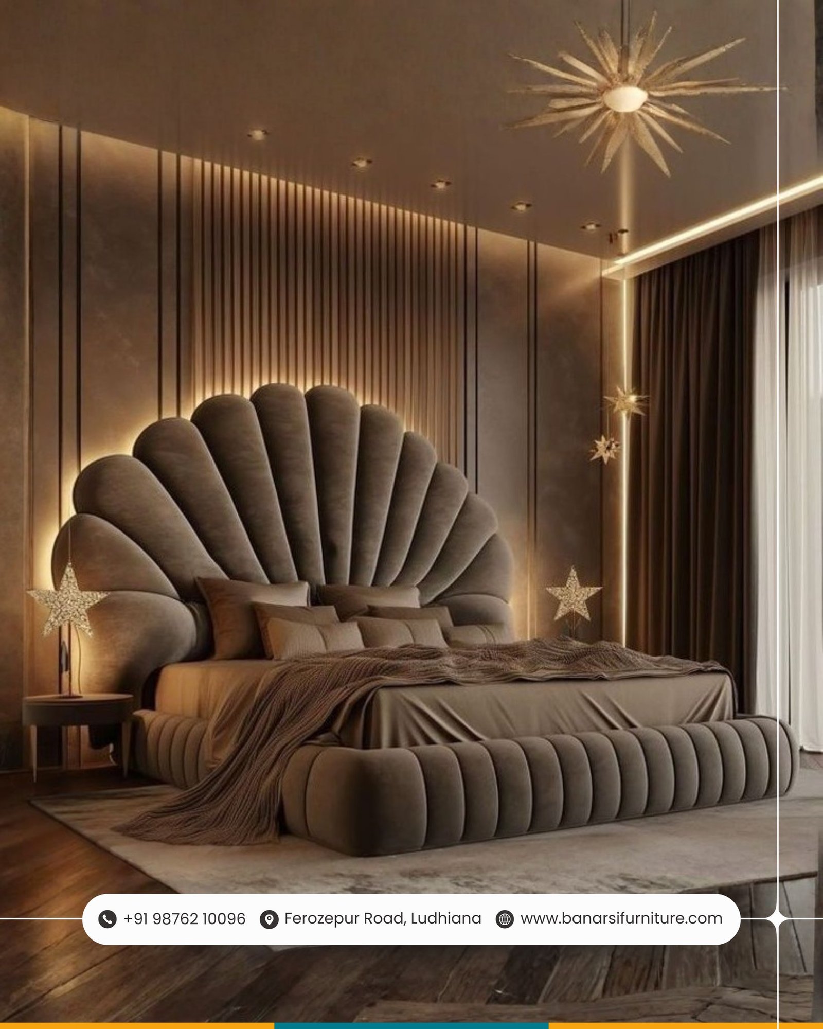Create a bold statement in your bedroom with this ultra-luxury king-size upholstered bed, featuring an iconic shell-inspired headboard. The dramatic sculpted design instantly becomes the focal point of any space, while the plush full-body upholstery delivers unmatched comfort and premium elegance.