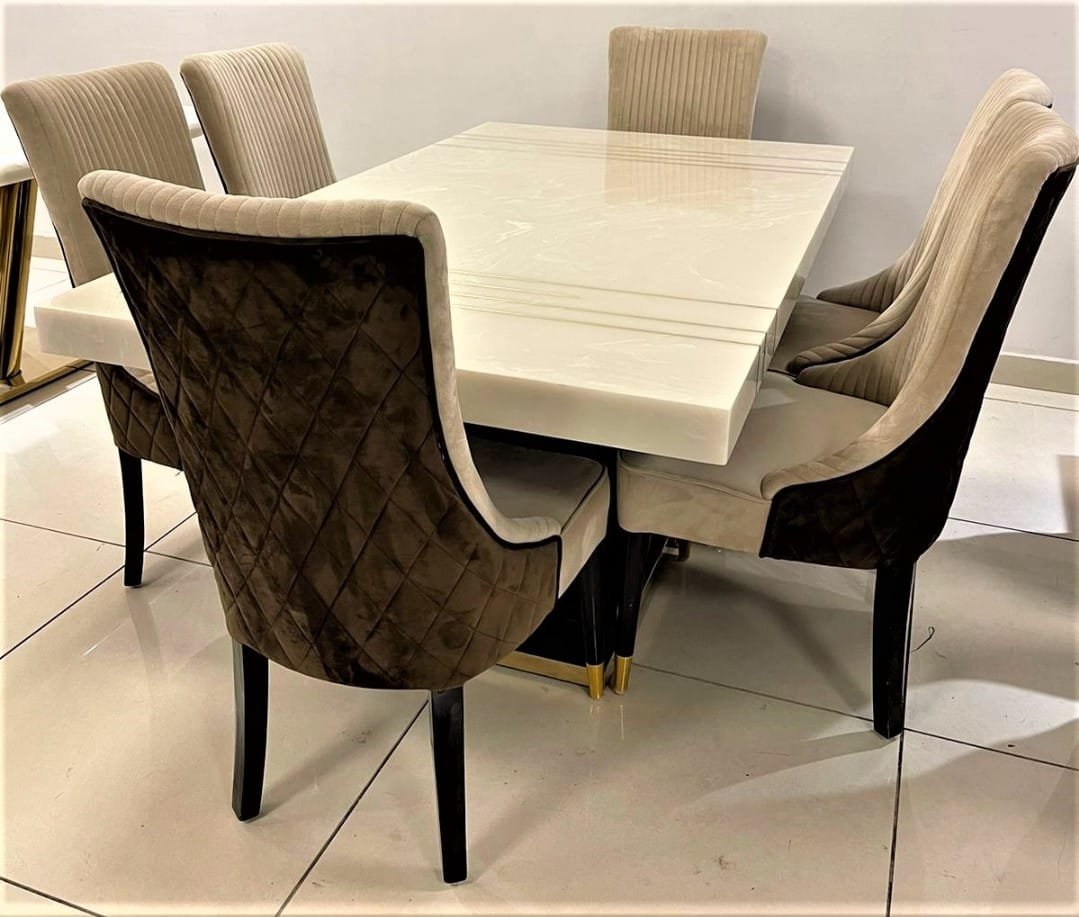 Add sophistication to your dining area with our Marble Luxe 6-Seater Dining Set, a perfect blend of modern elegance and timeless comfort. The high-gloss marble-effect table top brings a sleek and refined touch, while the dual-tone velvet chairs in beige and rich brown add depth and cozy luxury.