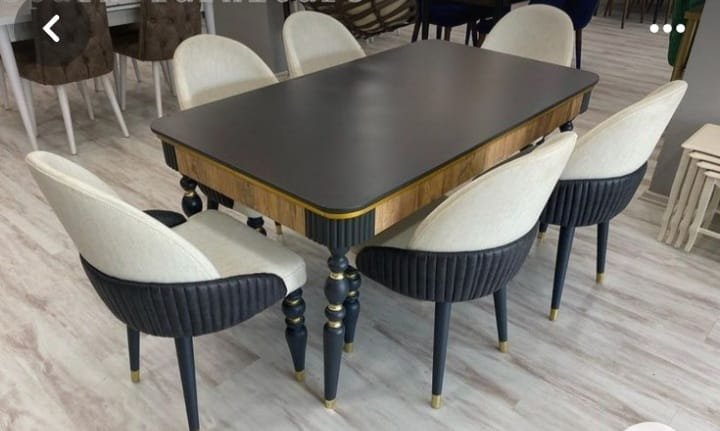 Color combo of this set is just 👌 – off-white and dark contrast chairs ke saath table ka golden trim bhi shine karta hai.