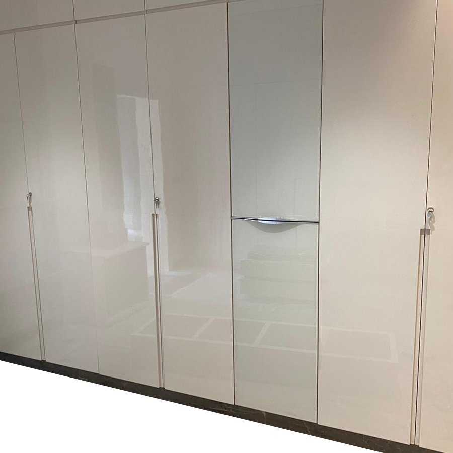 The GlossLine Wardrobe features sleek high-gloss white panels with minimalist integrated handles, offering a polished and modern storage solution. Its clean, reflective surfaces brighten the room and provide a seamless aesthetic, while the hinged doors allow easy access to a spacious interior designed for versatile organization.