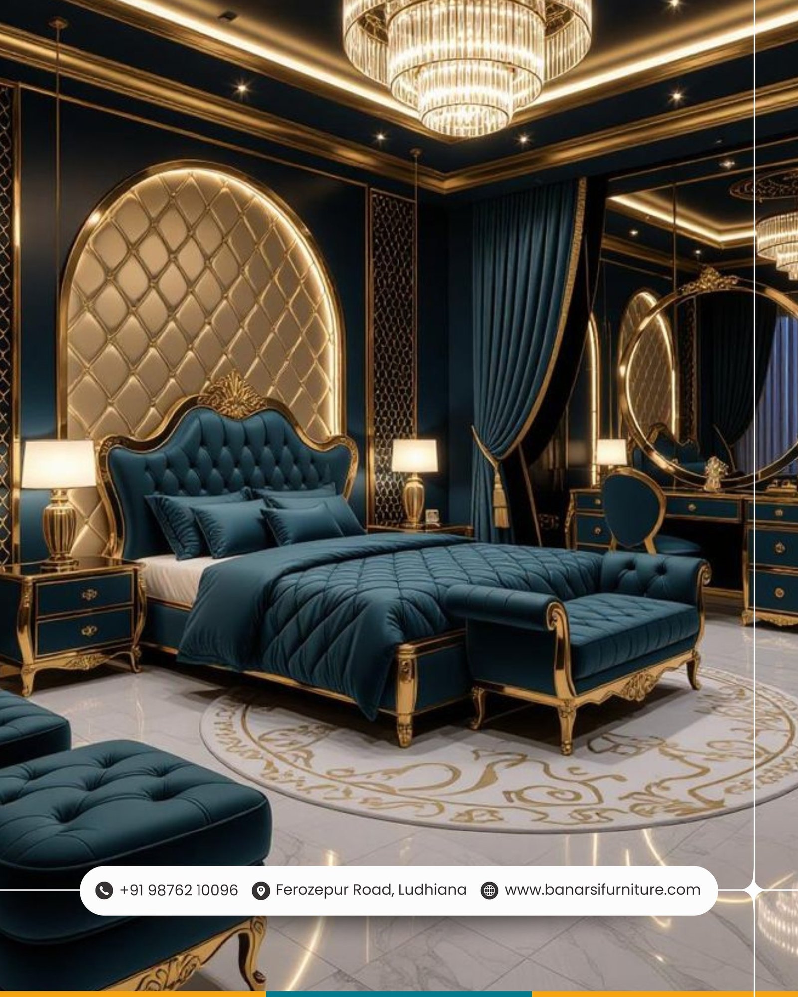 The stunning combination of rich navy tones with gold embellishment radiates royalty and sophistication. Paired with matching ottoman seating, side tables, and an extravagant dresser setup, this design evokes the charm of imperial European palaces.