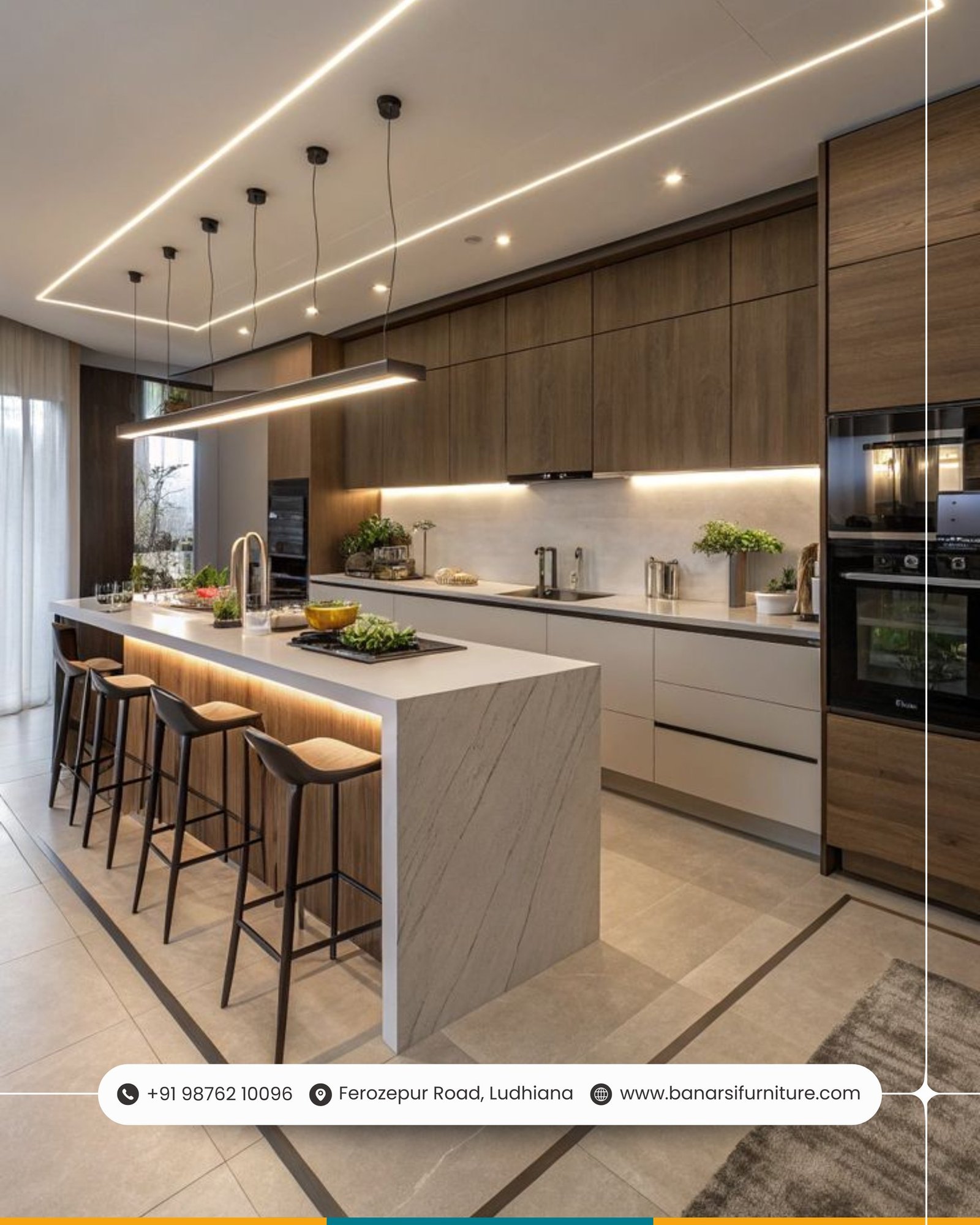 Contemporary Modular Kitchen with Waterfall Island & Ambient Lighting