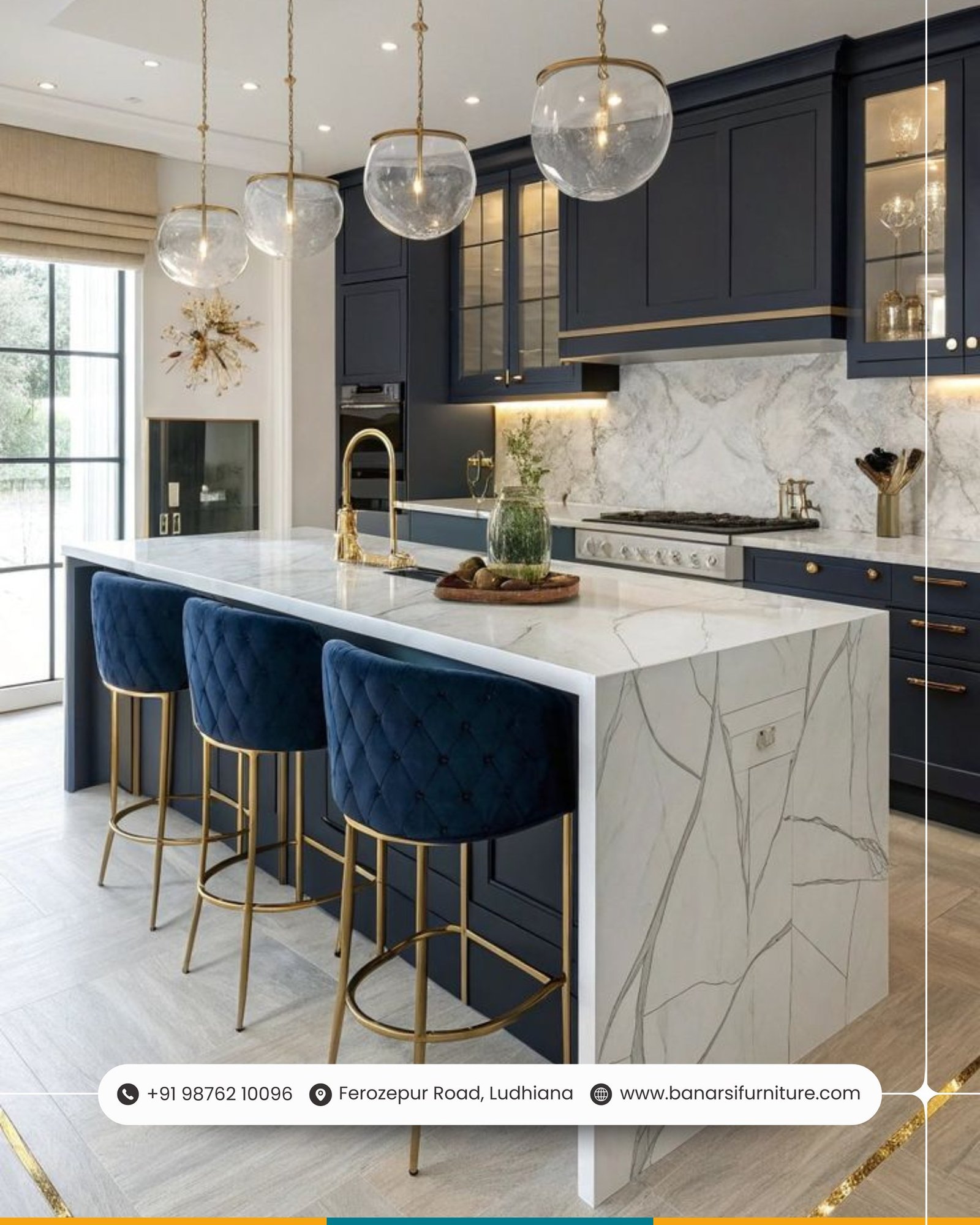 Luxury Modular Kitchen with Marble Waterfall Island & Navy Cabinets