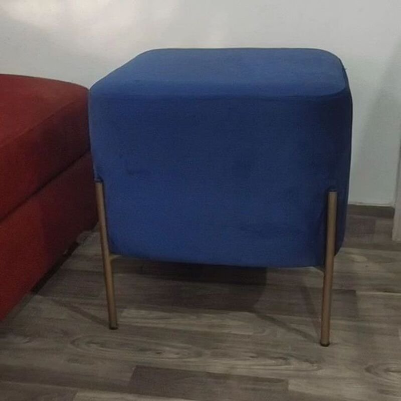 The BlueVelvet Ottoman features a plush square cushion upholstered in rich blue velvet, supported by slender metal legs with a subtle metallic finish. This versatile ottoman offers comfortable seating or a stylish footrest, adding a pop of color and texture to modern living rooms, bedrooms, or lounge areas.